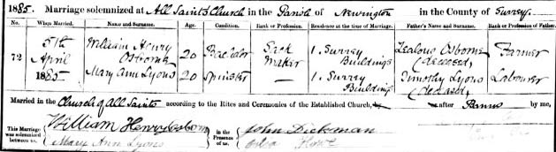 1891C. Living at 9 Woolf Street, John Hurley 33 waterside. labourer b. Bermondsey, Kaie 40[real age here nearer 50 but entry might actuslly read 48] , b. Ireland Cork, Timothy Lyons 20 carman, Kate Lyons 17 sackwoman, Bridget Lyons 15, all b.Bermondsey..[Ellen Hurley dies age 3 in Sep 1882]. In the same house is Kaie's daughter, Mary, who married [ M20, in a protestant church, see cert. below] William Osborne in 1885 : Mary Osborne is the informant, a' cousin', on 1894 d.c D19 of John Lyons: she was 15 when he was living in the same house, 26 College Street, as she in the1881C . If her father Timothy had indeed been John's brother , she would be John's niece: could this be an argument to say that Timothy & John were in fact just cousins rather than brothers, or is it just a loose use of 'cousin'?
