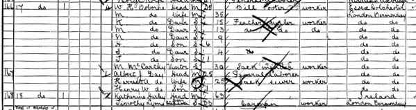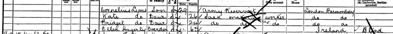 1901C: 18 Woolf Street Bermondsey, Katherine Hurley 63 widow no occupation given, Timothy Lyons 33 carman, Cornelius Lyons 29 army reserve, Kate 26 & Bridget 24 sack makers & Ellen Hagerty, 63, lodger b.Ireland blind . Where is Jeremiah?? Cannot find any of these Lyons children on Genes