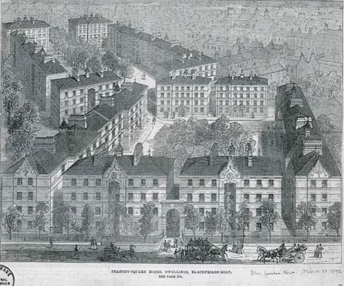 The Peabody Buildings were blocks of Improved Model Dwellings for the respectable Working Class, which replaced the slummiest homes with neat, weatherproof, clean, much sought after small flats. The living accommodations was self contained, though kitchen areas tended to be communal for all but the most basic cooking, and sanitary provision was also in sets. All they lacked were bathrooms (nobody but the extremely rich had them). The tenants were carefully selected, and were generally in steady work and not (therefore) the poorest folk. Other groups added block buildings like this, and there is an actual study of one of the blocks (published by the Open University). There are some records of tenants and the management committees.