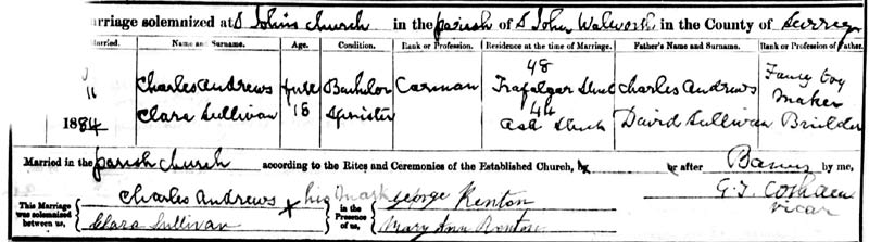 7. Clara Sullivan 1865 -1913?. . Born Lambeth 'Sep' 1d.330 . A nursemaid in St.Mary Islington in 1881..Married Charles Andrews, 1863, in St. John the Evangelist, Walworth on 11/11/1884: she then given as 18. Charles was the eldest son of Charles Andrews, 1842, eldest brother of Hannah Andrews [my ggran], who married John Sullivan, elder brother of Clara in the same quarter. By 1891 Charles, 28,carman, & Clara, 25, have 3 children, Charles 6 b.Walworth, Annie 2 b.Walworth & Arthur 3mths b.Lambeth.; family living 3a Pleasant Place, Lambeth. By 1901, family living at 5 Opal Street Lambeth, Charles 37, coal porter, Clara, 32, toymaker, Charles, 16, greengrocer, Annie, 12, & Arthur 10. 1911C, Charles 48, coal porter, Clara 45, Charles 26 coal porter, Arthur 21, painter labourer, living in 3 rooms 49 Draycott Avenue, Chelsea. Charles probably died, aged 48, in Dec 1912 Lambeth 1d 232, no will. . Clara Andrews probably died, stated age 45, Chelsea Jun 1913. No will.