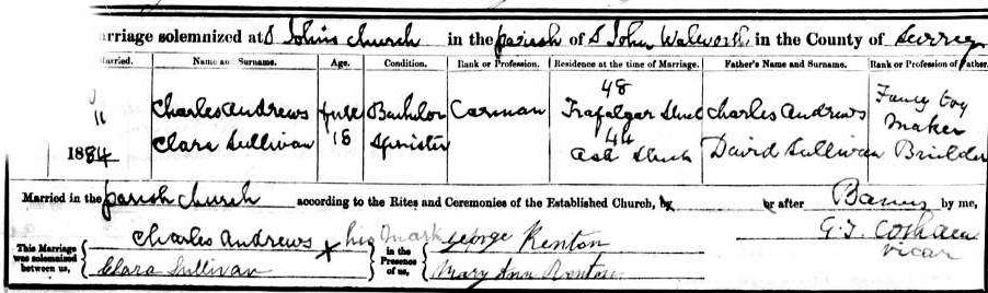 Clara was the 11 year younger sister of John Sullivan who married Hannah Andrews[ Charles' aunt] one week later, 18/11/1884 in Southwark Registry Office.
