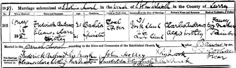 . . Another reason for thinking he was still alive is that he is not given as deceased in 1887 when his son, Frederick, marries. . . . .On a copy of a marriage certificate we have for Frederick Andrews and Eleanor Withey in 1887 it has Frederick's father down as Charles Andrews (1842), Fancy Toy Maker..Have this m.c from Vic Thomas[in Sullivan emails- will move to Andrews!]
