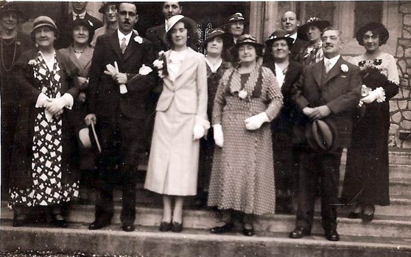 Ethel White's wedding to Robert Poole 11/9/1935. Parents Maud Marion and George White on right of photo, lady between them Jessie Maffey [his sister] with Jessie Lyons[M.M.'s halfsister] between Ethel & M.M, Hilda White at end on the right.