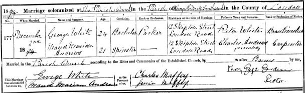 1894. Aged 21, married George White, 24, packer, in St. George the Martyr Church, 2/12/1894 , having Charles Andrews, carpenter[deceased], down as her father!.[ he, 1821-1870, in fact her grandfather ]. Address for both of them 12 Skipton Street, where she had lived since 1891 at least [York Street was renamed Skipton Street]. Thus they started their married life living with her mother and grandmother. Do not have this certificate: did Joan send me it?