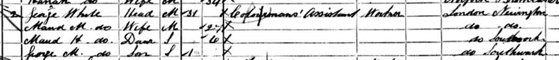 1901C. Living in 2 rooms at 194 Southwark Bridge Road, Southwark. George White, 31, colourman's assistant, Maud M. White 27, Maud H. 6, George M 1, both children born Southwark.