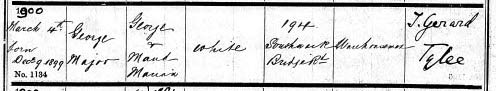 1900. George Major White , born 9/12/ 1899, bapt. 4/3/1900 in St.Alphege Church. Dies Mar 1906, aged 6, Lambeth. Family now living 194 Southwark Bridge Road. Husband George White described as Warehouseman. I wonder if Major were the maiden name of George White's, ~1870, mother?