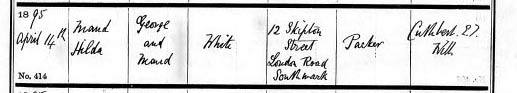1895. 2/2/1895 her grandmother, Elizabeth Andrews, dies at 12 Skipton Street. Her first child, Maud Hilda White, born 8/3/1895, bapt.14/04/1895 at St.Alphege Church; thus born within 3 months of the marriage .. Still living at 12, Skipton Street. Husband George White described as a Packer.