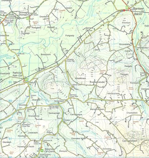 Within this overall area the focus is on the civil parish of Clonmeen, especially the townland of Muingyroogeen and the adjoining townlands of Knockeenatuder and Kilmacurrane, but also involves the adjacent civil parishes of Dromtariff and Kilcorney. The Catholic parish of Banteer serves both Clonmeen and Kilcorney civil parishes.