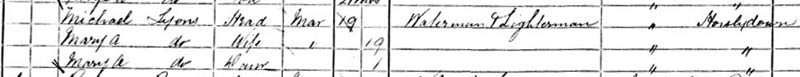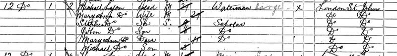 At 12, Curlew St, Horsleydown, in 2 rooms, Michael Lyon 29, waterman, Mary Ann 29, Mary Ann 11, Stephen 9, John 6, Michael 3, all born St.Johns. 3 other families in the house.