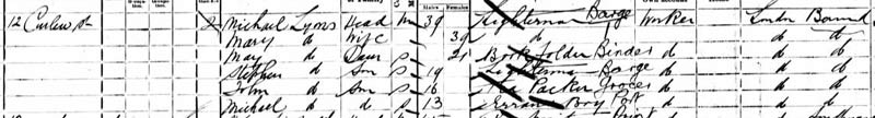 Michael Lyons [mistranscribed as LYNS] 39 Lighterman barge, Mary 39, Mary 21 bookfolder binder, Stephen 19 lighterman barge, John 16 tea packer grocer, Michael 13 errand boy port, still living[ as in 1891] at 12 Curlew Street, still just 2 rooms, Bermondsey[ near river, to east of Tower Bridge Road].