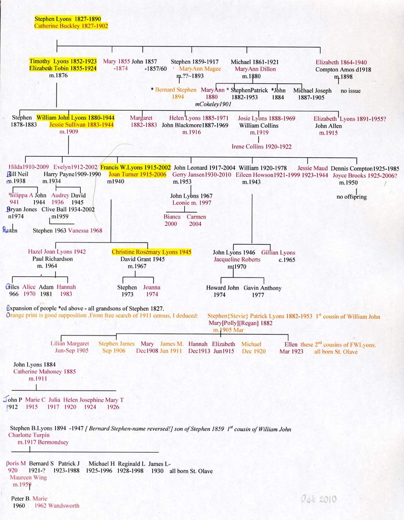 2. Stephen Patrick 1882-1953. It is thought that he was friendly with his cousin,William John Lyons 1880, my grandfather, meeting for drinks in the pub, 1914-1930 say. He was also very fond of Opera and used to take my aunt Hilda,1910, to the Old Vic, say 1924-30. Think he was known as Stevie.Marriages Mar 1905 LYONS Stephen Patrick St. Olave 1d 276 [not in protestant records!]. This is probably to a Mary Regan , known as Polly[info.from Hilda 2009]. Marriage not in St.Georges, nor La Salette. Try Dockhead 2010.