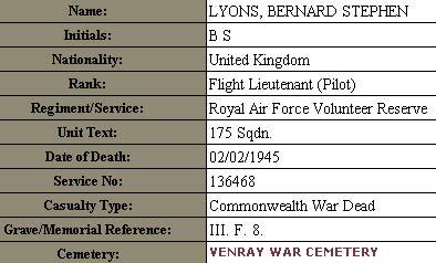 The above is almost certainly the Bernard S, born Louth 1921 and not ours born St.Olave. The Bernard S b.Louth had parents Harry Lyons & Alice Parish who married 1914,Grimsby, and brothers Harry, Leonard W and 2 sisters. Alice Parish was born Louth 1883 and a Stephen Parish had married in Lincolnshire in 1870!: so this other Bernard S. could well be Bernard Stephen!!! 29/12/2009 contacted a Melanie who has Bernard & Alice, Louth, on her Genes tree: no reply. April 2010 asked for permission to look at her tree!