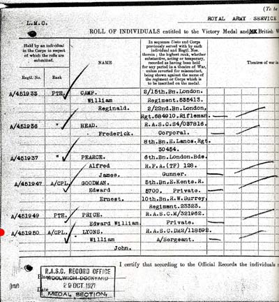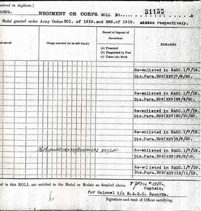 Also September 2007, the firm J Collins Medals Ltd did a search from the medal Roll: this records his rank as, conflictingly, A/CPL and A/Sergeant?, and states that he re enlisted [as did many others on the same date] into the RASC on 1/7/1919 at the end of the hostilities and was discharged 12 November 1919, surplus to Military requirements. Some 60% records were destroyed in the Blitz in 1940, and his must have been amongst these.