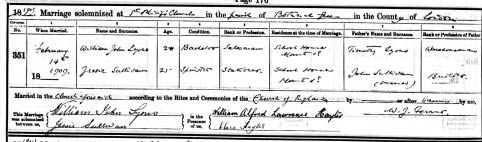 1909 14/02/1909 Aged 28, married Jessie Sullivan , aged 25, in St. Philips Church, [Jessie was protestant], Bethnal Green. Marriage Certificate M5. Witnesses were Clara and William Alfred Lawrence Hayter. He is given as salesman, she as stationer.His father, Timothy, is given as Warehouseman, hers, John Sullivan,deceased, as Builder. A joint address is given of School House, Mount Street [Bethnal Green]..