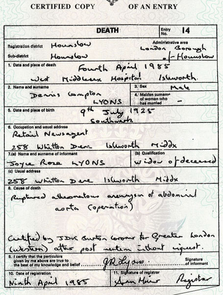 1985. Died on 4/4/1985 at the West Mddx hospital, Isleworth. Cause of death was rupture of abdominal aorta, during or after operatedon