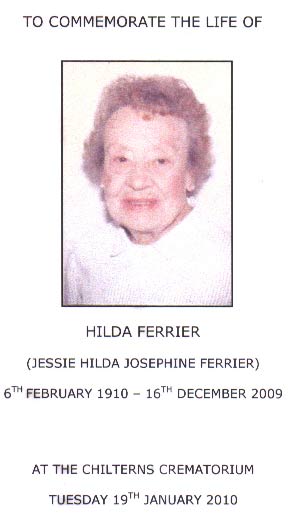 Hilda stayed living at 8 Kynance Gardens well into her 90s. Eventually she had to go into a home, Manor House, Manor Road, Kenton, where she was well looked after by caring staff. I last visited her there in August 2009 and we shared a few laughs on her past life. Finally, just 7 weeks before her century, she was admitted to Central Middx Hospital and died within a few hours, 16/12/2009. She was cremated at the Chilterns Crematorium in Amersham 19/1/2010.