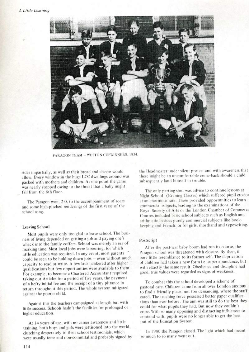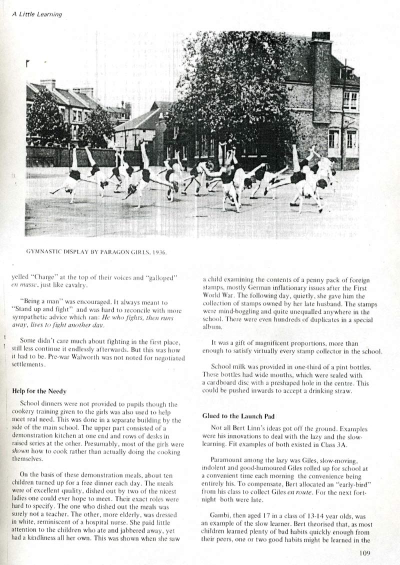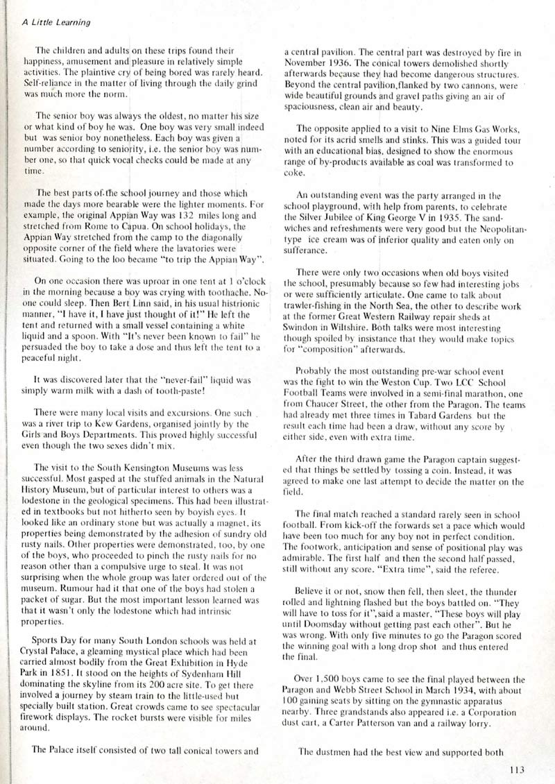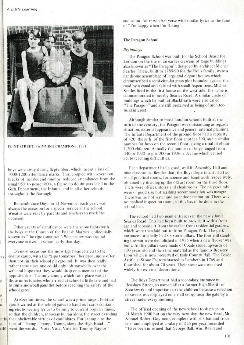 In 1872 Chief Inspectorate of Schools described Southwark as 'an educational desert: the people were degraded, the streets dirty and unswept, houses had little or no accomodation, refuse was thrown out of the windows into the streets and teachers were hooted and had refuse hurled at them' . Most real education was undertaken in Nat.Schools, but the clergy controlled both the religious and educational life of the country, founding schools wherever possible. By 1900, Southwark had 44 such schools. Often parents saw no relevance between the education a child received and real life. . .Prize giving had overtones of Trooping the Colour: held on Empire Day, May 24, it was renamed Commonwealth Day in 1936, pupils receiving a half day holiday. There were tests and exams half yearly, but also weekly marks, with names being moved up and down on a board accordingly.. Flint Street School had snow fights with the boys at the Church of the English Martyr, colloquially known as 'the ripe tomatoes'.[ So, Frank's father must have decided the teaching at the Paragon was superior to that of the school of the English Martyr.]. The Paragon opened 21/03/1900 ,with its head paid £26 per year: there was no hot water & no indoor sanitation. Mr Samuel Robert Goymour was its headmaster from 1900-1925, followed by Oliver Cornelius Foden [ so Frank would have known them both] .The Paragon's School song was: 'We know not what the future years For us may hold But what we can at present store May prove worth more than gold. So as the moments fly - a - long Let's knowledge gain, with effort strong. Paragon tip - top Strive for this without a stop From good to better then to best Are steps to take without a rest . Paragon tip - top, Paragon tip - top'. . . The school badge was a simple, gold 'P', worn on a 'pimple' [cap] or on the breast of a coat. The school enjoyed a good reputation, with good teachers and was turning out boys of a fair standard. . Two of its most popular hymns were 'Lead us heavenly Father lead us' & 'Blessed are the pure in heaven'. School milk existed in third of a pint bottles - probably had to be paid for.