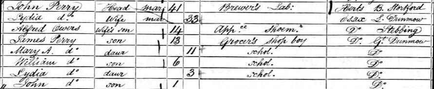 As James Perry and Mary A.Perry must be children of John’s first marriage, he was living in G.D.1847-1850 - when James & Mary Ann were born- whilst Alfred was obviously born out of wedlock The m.c. gives John as a widower : he was married in Dec 1841 to a Mary Ann Sach and she died Mar 1850 or Sep 1851. In 1841C, I think he is living in Stebbing with Joseph & Sarah Perry, aged 50 [see James Perry page] but he is not noted there as being born outside Essex [but then Bishops Stortford is right on the Essex/Herts border].