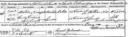 1872. Emily Victoria Parchment marries Walter Diss 22/10/1872 in the Parish Church of Bethnal Green, . Father Samuel Parchment,silk manufacturer, & bro. in law Henry Goodwin [ husband of sister Caroline Parchment] are witnesses. Residence for both is 55 Viaduct Street, and his occupation is a baker. His father Walter Diss is also a weaver,