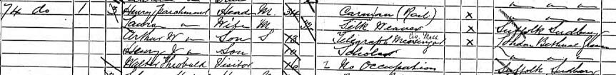 1911C Henry Frederick Parchment living in Newton Road Sudbury, aged 54, out of work carman, wife Laura 53, 4 children 2 died, & niece Ruth Parchment, 15, visitor .