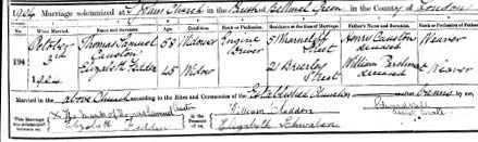 1904. Elizabeth Fedden remarried, aged 45, 3/10/1904 at St.Johns, Bethnal Green, Thomas Samuel Causton, aged 58[actually ~67]. Her address 21 Bruely/Brierly?? Street, B.G.. He was an engine driver, who seemingly could not sign his name. .[born 1837, one of 13 siblings, to William Causton 1806-1862 & Elizabeth Lane 1813-1865]. One of the witnesses was William Fedden, presumably her 20 yr old son. I thought she might have known this Engine Driver through her dead husband's work, but actually she was friends with his 18 year old daughter, Esther Causton, back in 1896, when Esther was a sponsor to her daughter Florence Maud Fedden. .