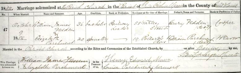 1882. Elizabeth Parchment married, aged 20, William James Fedden, aged 36, railway porter, on 9/10/1882 in St.Judes, Bethnal Green. He was living at 58 Warley St., she at 19 Pollards Rd. His father, Henry Fedden, was a cooper, hers, William Parchment, deceased, a weaver. Her sister Louisa Parchment, her mark, was one of the witnesses. A Fedden Family Tree exists on Ancestry. William is 16 years older than she is.