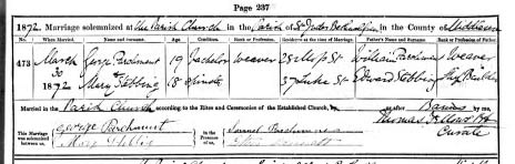 1872. George Parchment married 30/03/1872, aged 19 Mary Stebbing, 18, in St.Judes, B.G. His father, William Parchment, a weaver, hers, Edward Stebbing ,a ship builder. Witnesses were Samuel Parchment, his uncle? & Ester Bennett [she a niece of his mother Charlotte].His address was 28 Moss Street. Mary Stebbing is in 1871C, aged 17, a seamstress, born Mile End Old Town, so born in 1854?, father Edward born Whitechapel is 54 in 1871C