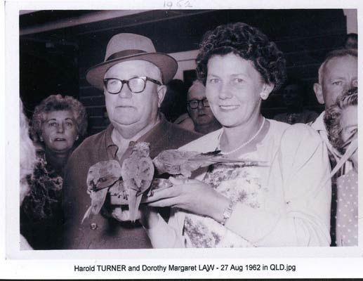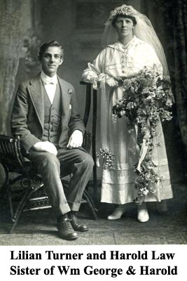 1917. Marries Harold Job Duerden Law, b.2/08/1894 Bury, Lancashire, on 24/02/1917 in Greensborough Methodist Church, Greensborough, Victoria. His residence Middle Park, parents Enoch Law & Ada Duerden. Her residence just Greensborough, home duties, age 22. Her parents George Turner, farmer, & Charlotte Parchment. His parents Enoch Law, paper bag manufacturer, & Ada Duerden. Witnesses Lillian Kerr - most likely other, older, bridesmaid - & Fred Wright -bestman. Do not know who Lillian Kerr was.