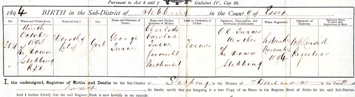 1894. Born 9/10/1894 to George & Charlotte [nee Parchment] Turner at The Down, Stebbing. Father a farmer. Has 2 older brothers. Have b.c. BT6. Birth registered 16/11/1894 by her mother. Baptised 11/11/1894 in Stebbing, record in the Primitive Methodist Register Book of Baptisms at Braintree. Father again given as farmer. Have this baptism record.