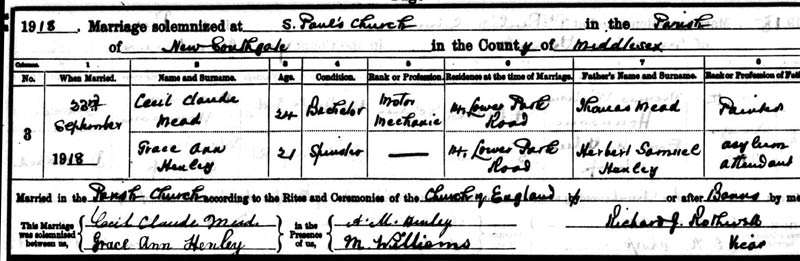 Cecil Claude MEAD; 17/09/1894- 17/2/1982. His sister Minnie is buried in Feltham, Middlesex cemetery ( my dad Terence was at the funeral - in 1950??). His brothers were killed in the 1st Worlds war we believe. I think he only had one brother, George Robert Mead 1891 - see above