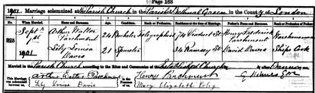 1.. . . . . . . . . .Walter Arthur Parchment b.9/6/1877, baptised 24/6/1877 St .Jude, father labourer of 55 Viaduct St..He, a telegraphist, married, on 1/09/1901, still at 74 Viaduct Street, Lily Louisa Davis in St. Mathew, the parish church of B.G, his father, Henry Frederick Parchment, a warehouseman ,. and Henry Parchment,1881?, was a witness. Lily Doris Parchment was born Mar 1903 . In 1911C, Arthur Walter Parchment,aged 33, telegraphist-railway, living in Hackney with his wife, 31, nursery shoe maker, & Lily Doris 8.. Their last child was Irene A. Parchment Jun 1912, in Hackney.