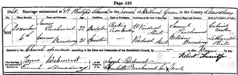 1868. James Parchment, aged 22, packing case maker, marries Emma Broadway, 21,on 6/12/1868, at St. Philip's Church, B.G. His address is 55 Viaduct Street, hers just Viaduct Street. His father, Samuel Parchment, is a Cabinet Maker, hers, William Broadway, is a Lithographic Printer. Both signed. Witnesses are Samuel Parchment & Charlotte Parchment, her mark - his parents